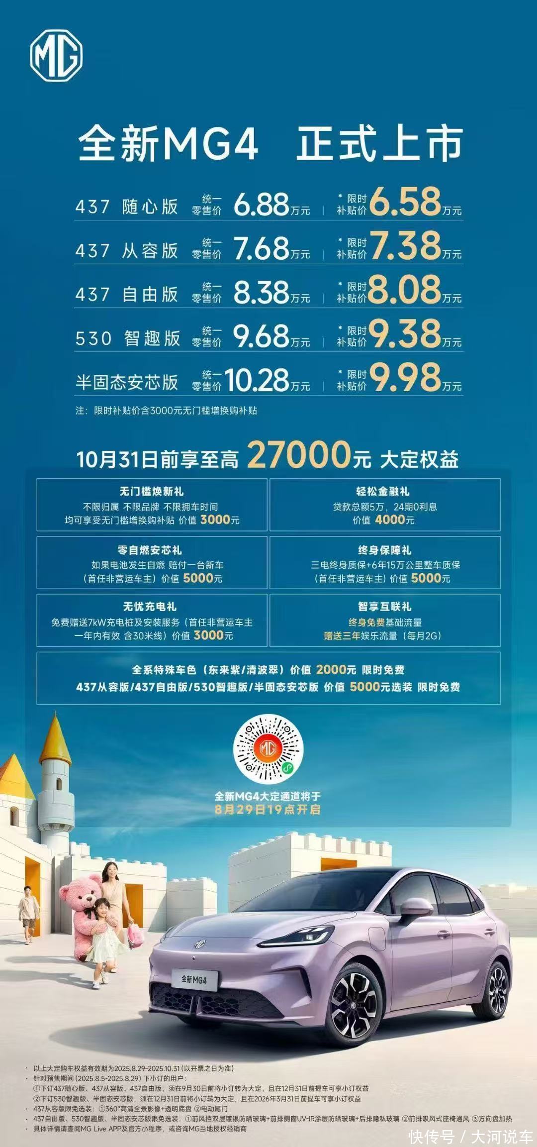 □大河报·豫视频记者 史歌 国家队打出王炸牌。8月29日,上汽集团名爵品牌全新MG4在成都车展上正式上市,限时补贴价6.58万元起。其中,半固态安芯版车型售价10.28万元,限时补贴价9.98万元,...